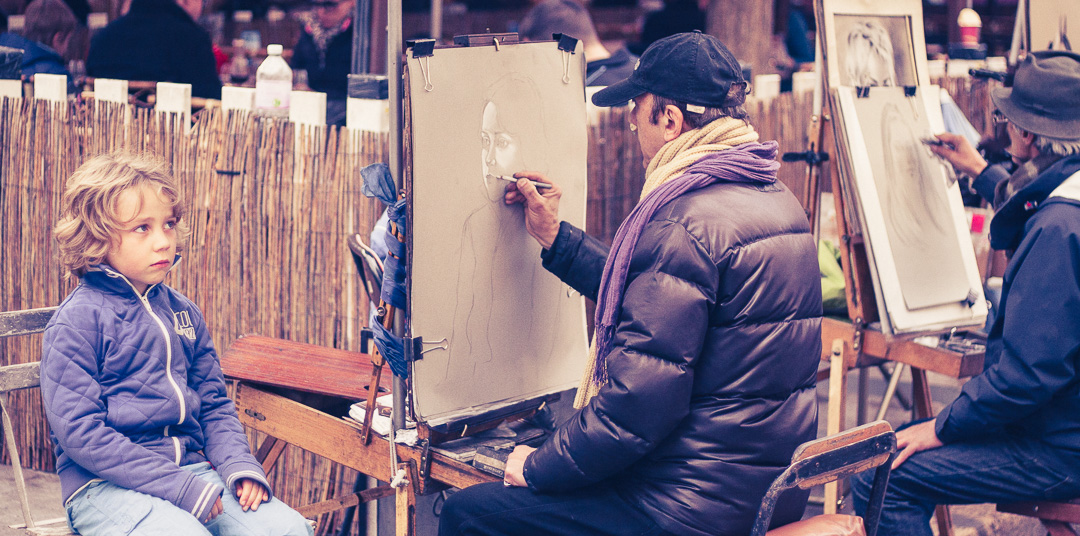 Terug op straat lopen we via Rue Steinkerque omhoog langs de vele souvenirshops naar het plein voor de Sacré Coeur. Een nadeel van Parijs in de lente zien, is dat iedereen dat wil. We klimmen de trappen op langs een mensenmassa. De ‘klim’ is de moeite waard want wat heb je een uitzicht vanaf hier! Nom Dieu! Vanaf hier moet de zonsondergang geweldig zijn. Tijdens het wachten daarop bezoeken we de Sacré Coeur, met een kleurrijk interieur. En wat ik nooit wist is, dat om de hoek Montmartre ligt. Hoe leuk is dat! Place du Tetres met cafés, terrassen en niet te vergeten de kunstenaars, alhoewel dat er vast minder zullen zijn dan in de dagen van weleer. Toch is het heerlijk om hier over de pleintjes en door de smalle straatjes te struinen.