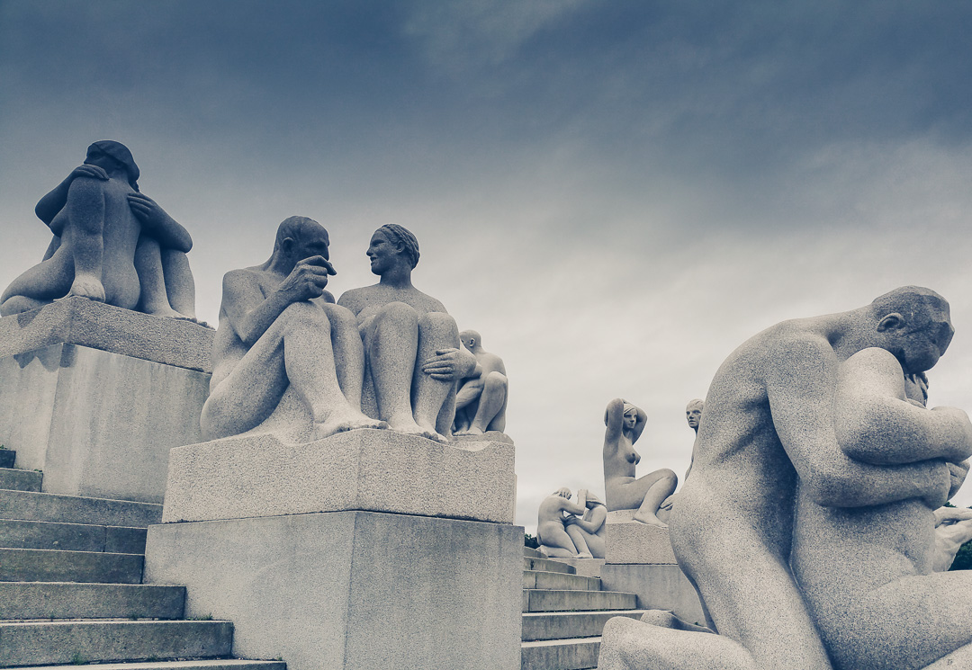 De meeste sculpturen zijn geplaatst in 5 grote groepen: De Main Gate, de brug met de Speeltuin, de fontein, het plateau met de monoliet en het wiel des levens. Gustav Vigeland was erg geïnteresseerd in de relaties en interacties van/tussen mensen. Dit komt tot uitdrukking in al zijn beelden.