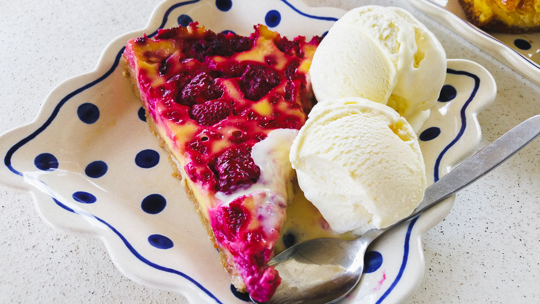 Het mooiste plekje van Møllerens Hus is de veranda waar je heerlijk kunt zitten en genieten van het uitzicht op Strømsfoss en de bootjes op de rivier. Waar je je kunt laten verwennen met koffie, thee of limonade en een punt eigengemaakte taart. Met een beetje geluk komt de taart net uit de oven. We komen hier op adem met de lekkerste zelfgemaakte ijsthee en een punt appeltaart en frambozentaart. De lekkerste taart die we tijdens deze vakantie zullen eten maar het zijn de bolletjes vanille-ijs die het ‘em eigenlijk doen. Møllerens Hus is de moeite van het omrijden waard!